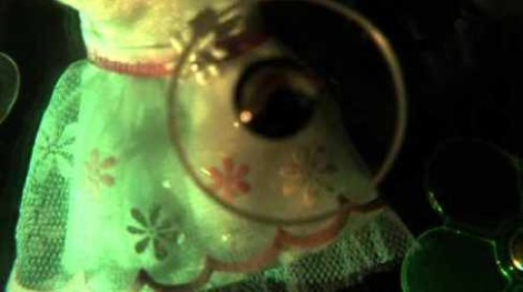 HD forensics: play with fugitive objects found by the roadside, lost things rediscovered. Choreography of a tiny white party dress/scratched marbles (assorted colours)/one glass lens from a pair of spectacles/a golden heart charm with an imitation diamond in the centre/green plastic flower decoration/a bracelet of tiny red glass beads/silver crescent moon (scuffed and pitted with rust)/a sliver of cracked wing-mirror... We set up the high definition camera and looked at found objects we'd picked up from the pavement or gutter whilst walking around the outer reaches of the city. On screen the HD image became a miniature landscape of nauseous clarity. We stepped into the picture in search of the poetic. Light shone through a 35mm negative found by the Laira estuary over Christmas, we saw someone's pet rat in reverse watercolours textured across the surface of tiny things. We weren't in close enough, so we held a glass disc in front of the camera lens, looking to capture the unknown exterior, caught fleetingly as light spilled across the ceiling of a curtained room on a summer's day. We remembered lying in bed at night as cars spun their headlights overhead, then vanished.