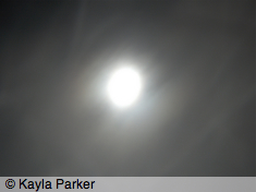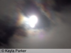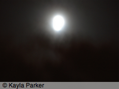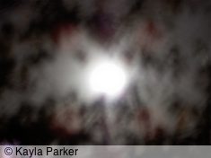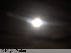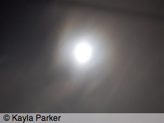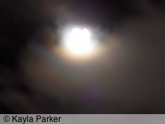 kayla's photo of full moon, visible as a white smudge with halo against black cloudy skykayla's photo of full moon, visible as light bands in sky of black clouds