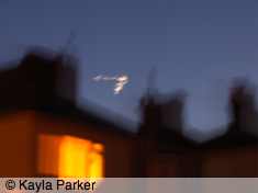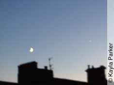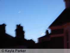 Kayla's photo of the new moon, just visible above rooftopsKayla's photo of the new moon, just visible above rooftopsToday’s new moon just before it slipped behind the rooftops into Beaumont Park; looking across to the pair of in-fill houses in May Terrace, built to replace part of the terrace taken out by WWII bombs.