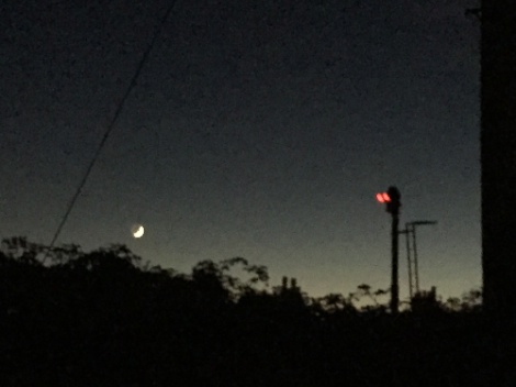 Photos of thin curl of new crescent, setting over the rooftops from Baring Street by Kayla Parker, taken down by the railway line in the back lane off Whittington Street, by Stuart Moore.