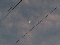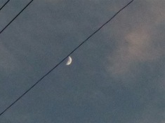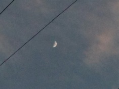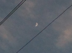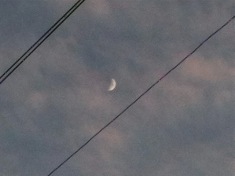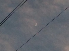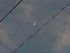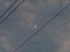 First sight of the new crescent, back garden, looking up through the telephone wires to a violet sky. Fresh wind gusting in from the west, twanging the wires. New moon, Tuesday 10 April.