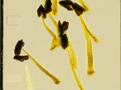 Image: section of 16mm test filmstrip with camellia stamens (April 2010)