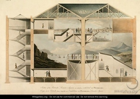 Etching depicting a section of Robert Mitchell’s Rotunda building in Leicester Square, London, in which was exhibited the Panorama. The image, published 15 May 1801, shows internal staircases and viewing platforms, with a large seascape panorama below and a smaller panorama above of London from the River Thames.