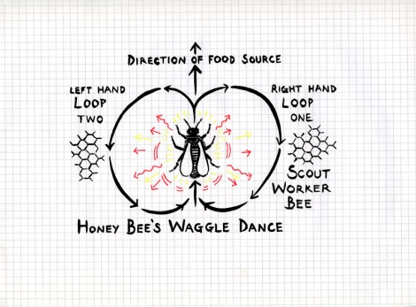 360 degree audiovisual floor plan for Nectar: diagram of honey bee’s waggle dance, which tells the other bees about the food source.